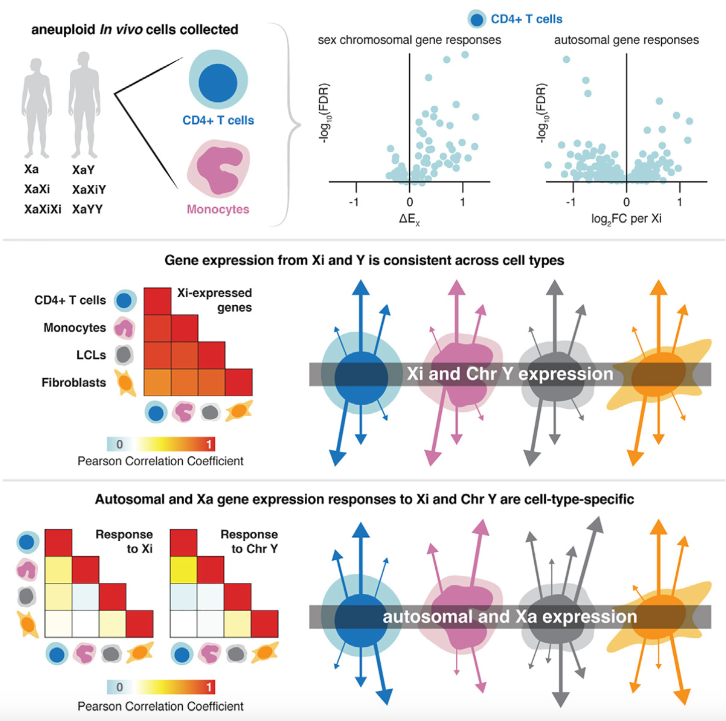 Abstract: Recent in vitro studies of human sex chromosome aneuploidy showed that the Xi (‘‘inactive’’ X) and Y chromosomes broadly modulate autosomal and Xa (‘‘active’’ X) gene expression. We tested these findings in vivo. Linear modeling of CD4+ T cells and monocytes from individuals with one to three X chromosomes and zero to two Y chromosomes revealed 82 sex-chromosomal and 344 autosomal genes whose expression changed significantly with Xi and/or Y dosage in vivo. Changes in sex-chromosomal expression were remarkably constant in vivo and in vitro; autosomal responses to Xi and/or Y dosage were largely cell-type specific (2.6-fold more variation than sex-chromosomal responses). Targets of the sex-chromosomal transcription factors ZFX and ZFY accounted for a significant fraction of these autosomal responses both in vivo and in vitro. We conclude that the human Xi and Y transcriptomes are surprisingly robust and stable, yet they modulate autosomal and Xa genes in a cell-type-specific fashion.